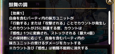 『感性』の保持数に応じて、自身を含む味方ユニットの被ダメージをカットする。
